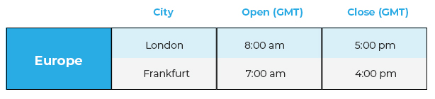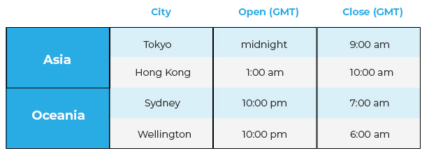 The day begins with the Asia + Oceania session. Centers in this region are located in Sydney, Tokyo, Hong Kong, Shangai, Singapore, and Moscow.