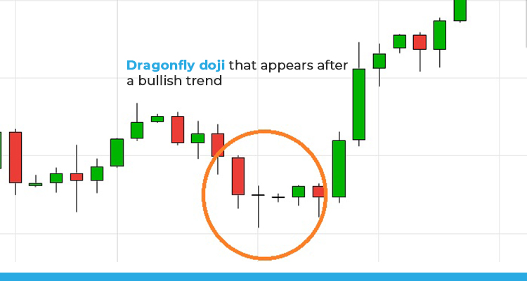 Dragonfly- type of doji that appears after a bullish trend. It marks reversal.