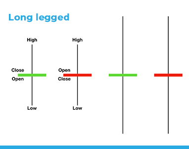 Long legged- type of doji that shows no one knows what to do because there has been a lack of price action after a strong trend in one direction. After this pattern emerges there may be reversal or consolidation.