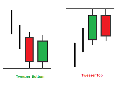 A tweezer top would appear in a bullish trend. Here the top of both the candles would be the same and the bottom of the bearish candle would be lower than the bullish one. This means that the highs are now at a standstill and the lows are getting lower. Therefore, the bullish trend will most likely be turning into a bearish trend soon.